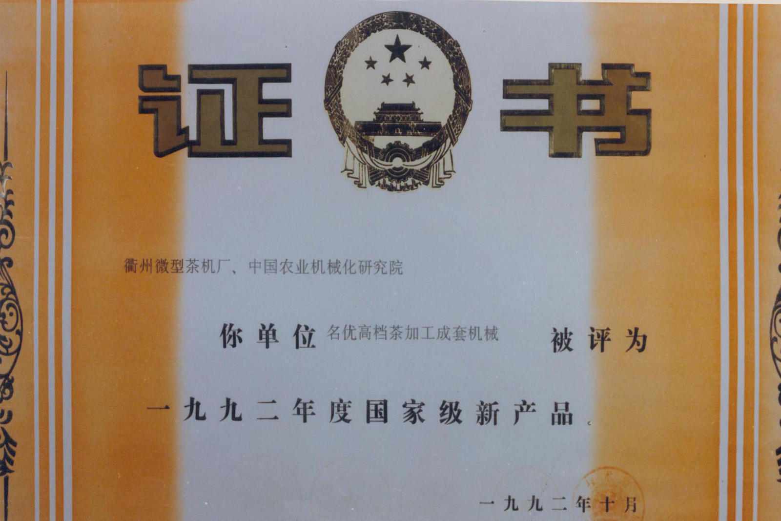 1992年10月,公司自主開發的“名優高檔茶加工成套機械”通過國家級新產品鑒定,促進與推動了我國茶葉加工向機械化、效率化、商品化方向發展。