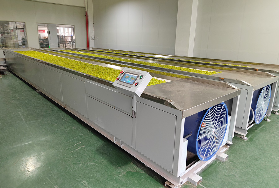 作業原理:單層式結構,機組采用的集中控制系統可精準控制鼓風時間、風量、溫度、攤葉厚度/重量等主要參數,實現攤青(萎凋)的均勻充分。 利用光電定位系統,能有效檢測茶葉流量,可自動控制茶葉進入下一步工藝流程。